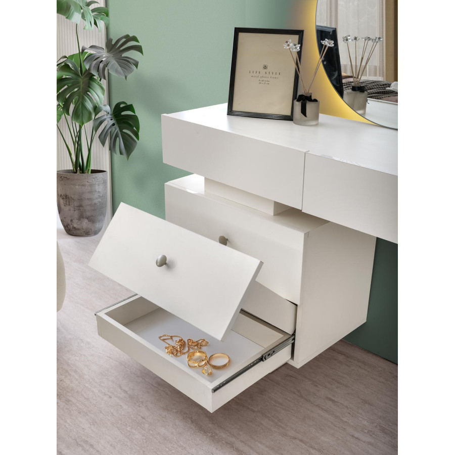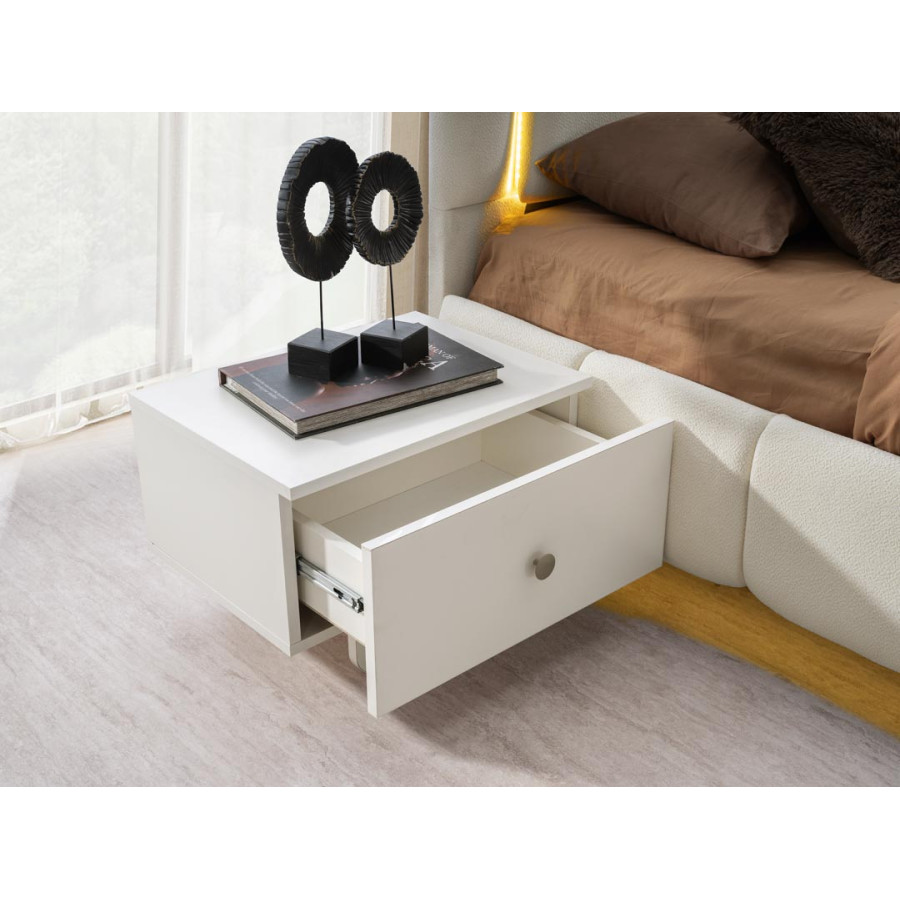 Komodin: Yatağın temiz beyaz bitişiyle uyumlu, minimalist ve yere yakın bir tasarıma sahiptir. Zarif yuvarlak kulplu çekmecesiyle modern çizgiyi tamamlar.