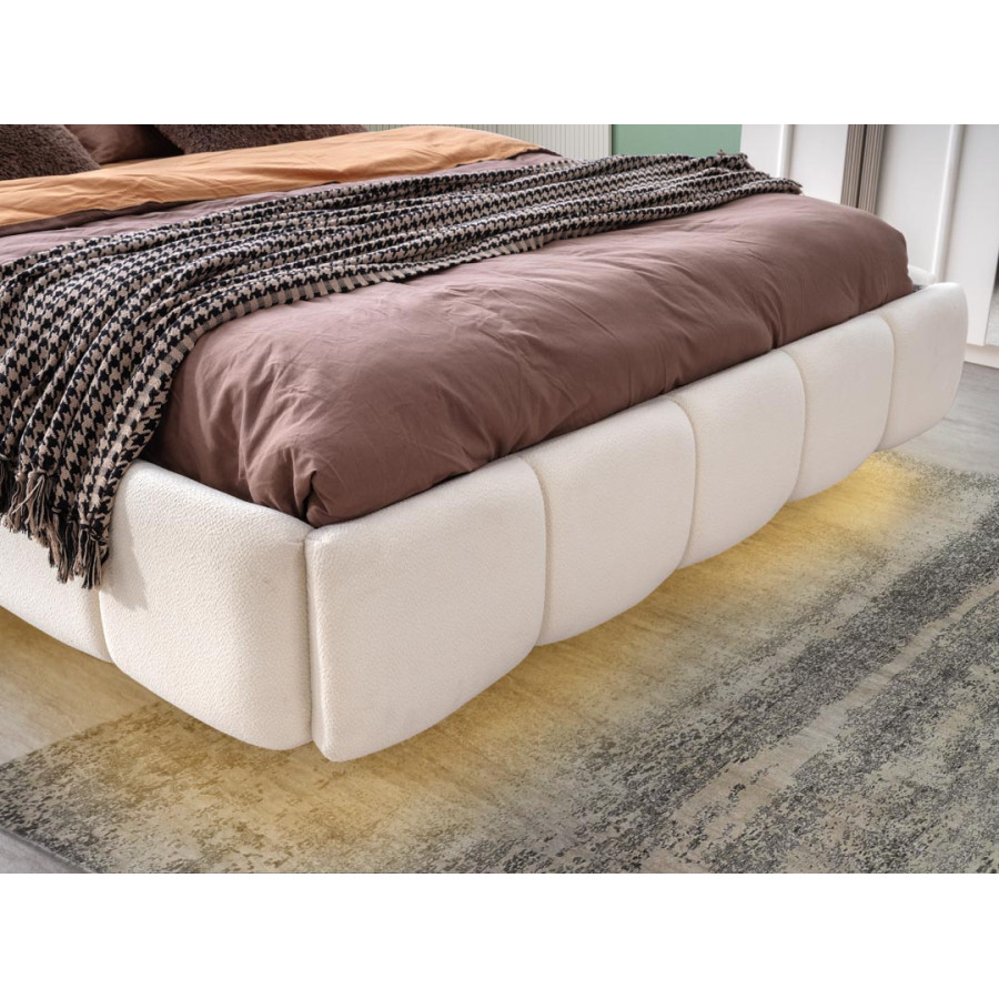 Modüler Döşeme: Karyola çerçevesi, yüksek kaliteli kırık beyaz bir kumaşla kaplanmıştır. Belirgin blok dikişli yapısı, yatağa konforlu ve bulutsu bir doku kazandırır.