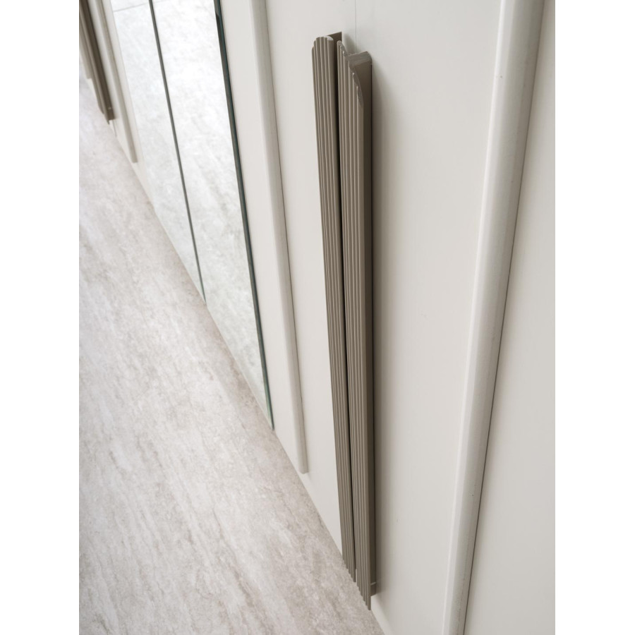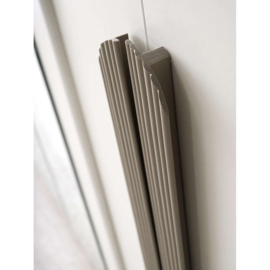 Karma Dokular: Pürüzsüz beyaz yüzeyler, kontrast oluşturan metalik veya ahşap tonlu dikey fitilli (oluklu) kulplarla birleştirilmiştir.